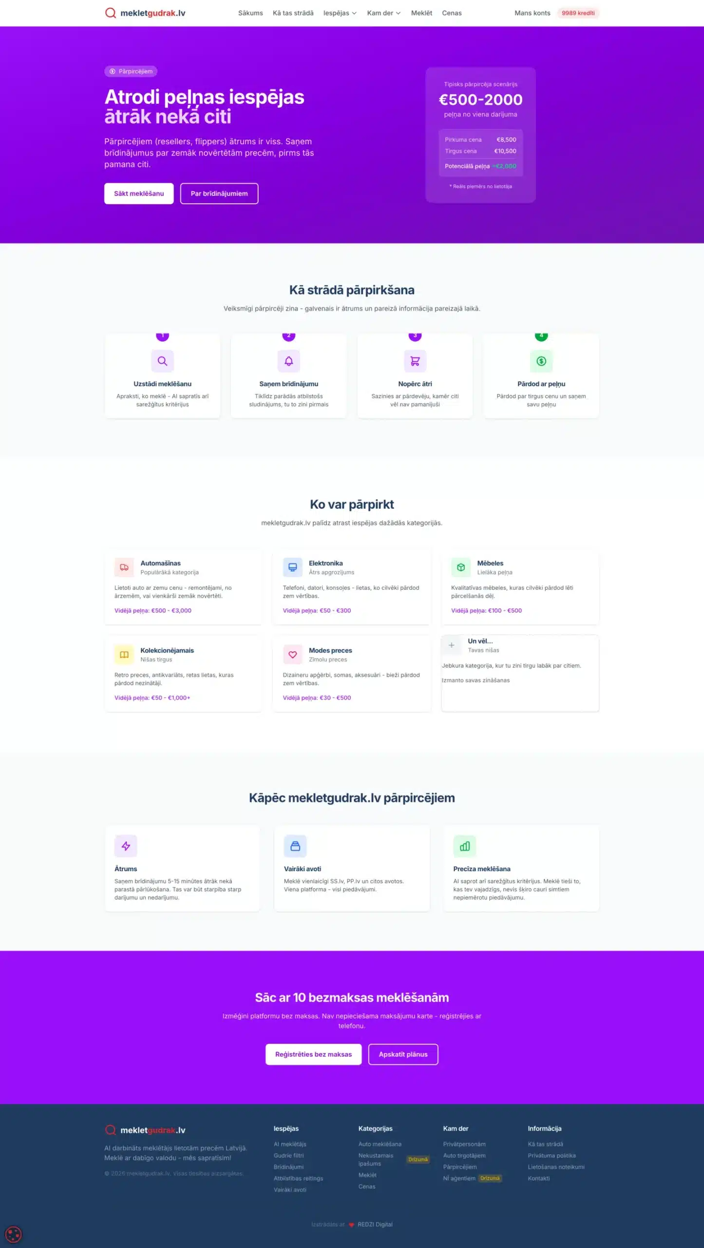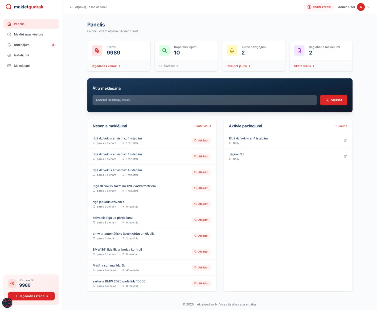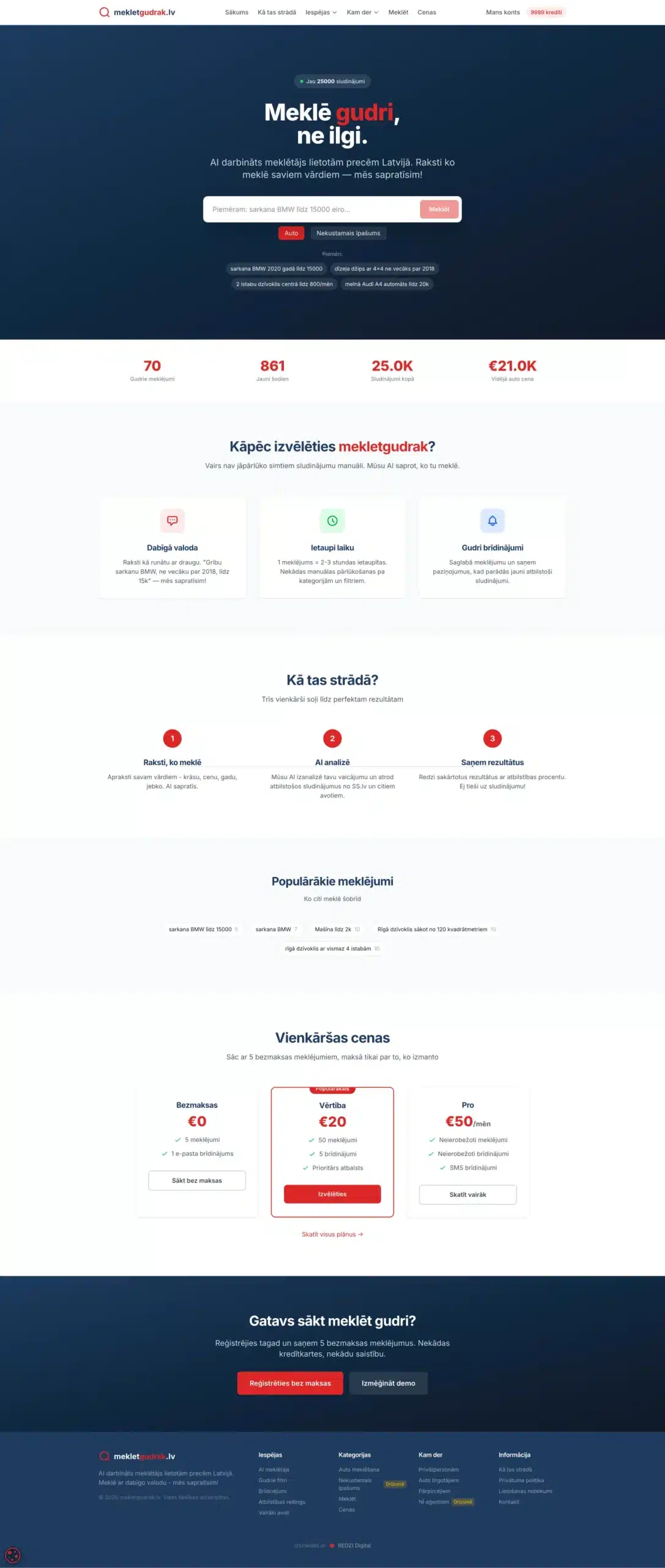 Oficiāli palaižam mekletgudrak.lv platformu publicēšanai. Sākas aktīva sludinājumu agregēšana un datu uzkrāšana. Lietotāji var izmantot gan bezmaksas, gan premium funkcijas, meklējot automašīnas, nekustamo īpašumu un citas kategorijas.